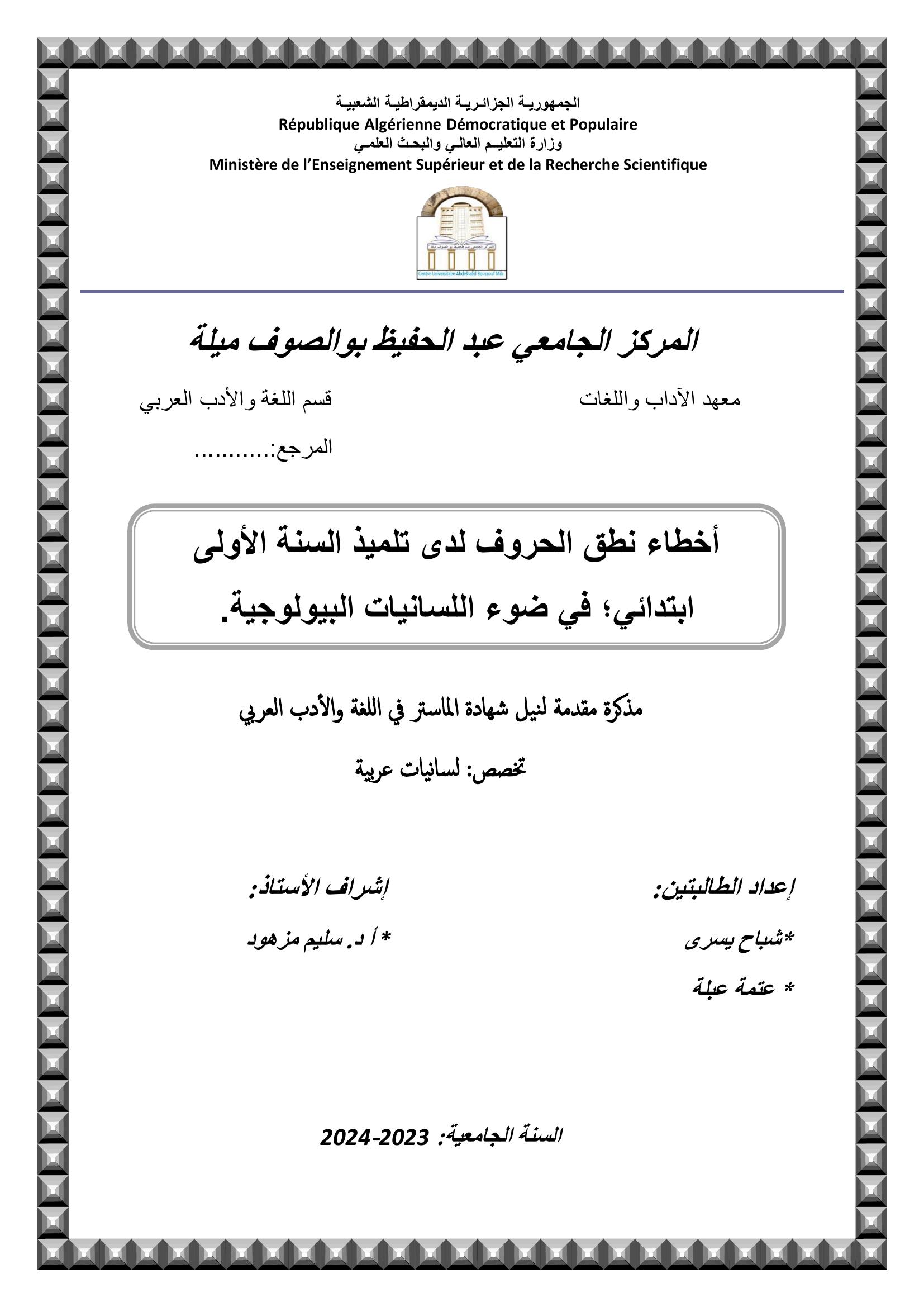 عتمة عبلة et al. (2024). أخطاء نطق الحروف لدى تلميذ السنة الأولى ابتدائي في ضوء اللسانيات البيولوجية (ماستر- ل م د) . المركز الجامعي عبد الحفيظ بوالصوف ميلة.