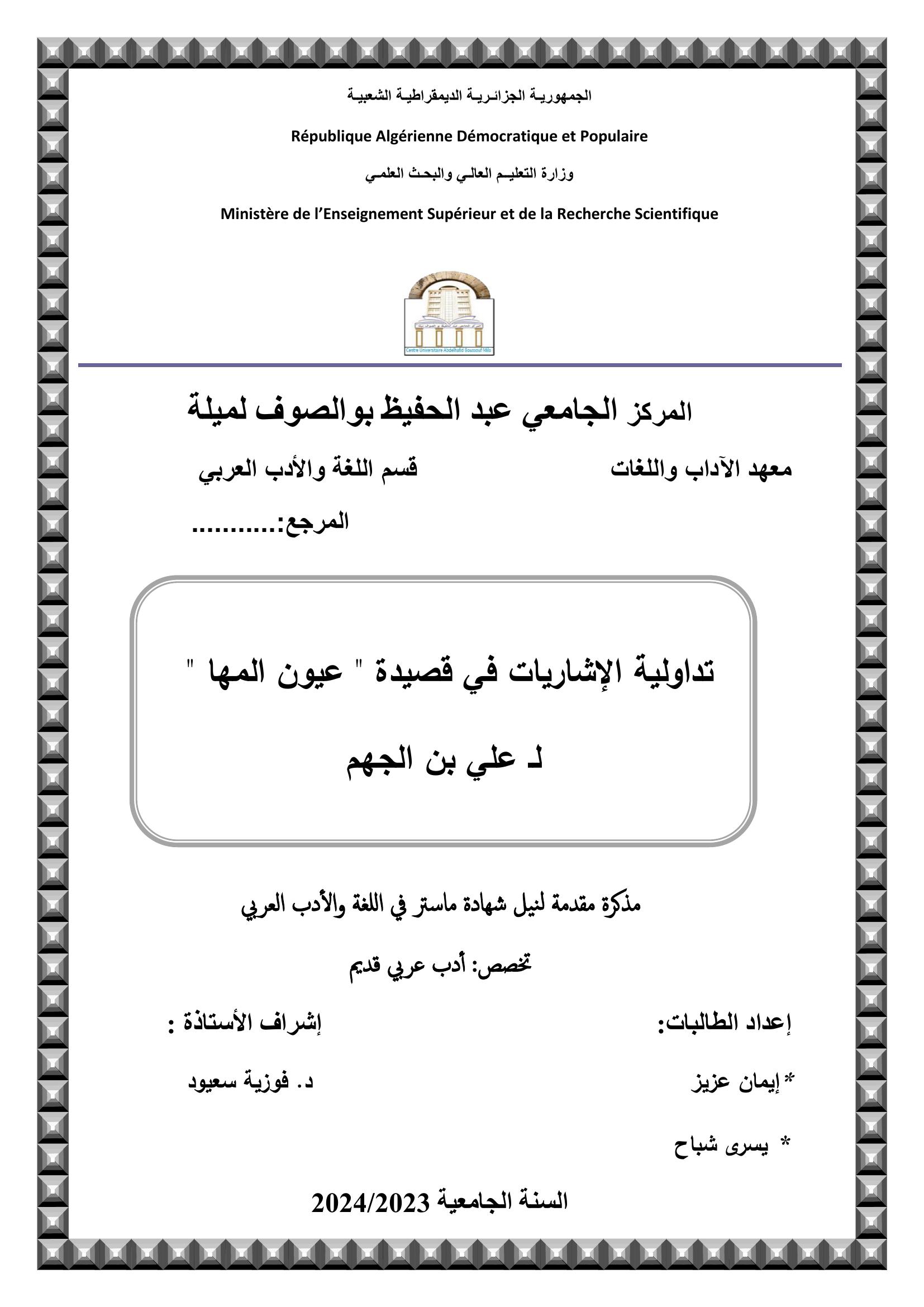 شباح يسرى et al. (2024). تداولية الإشاريات في قصيدة" عيون المها..." ل: علي ابن الجهم (ماستر- ل م د) . المركز الجامعي عبد الحفيظ بوالصوف ميلة.