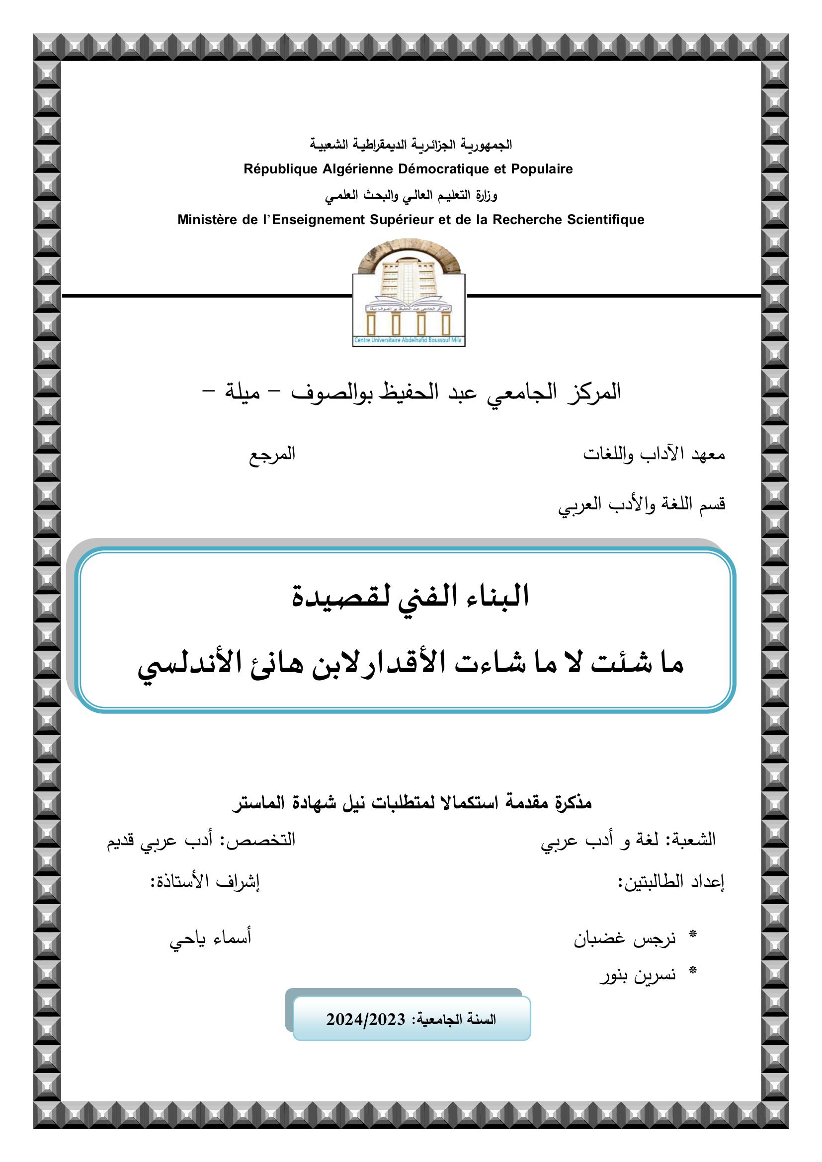 بنور نسرين et al. (2024). البناء الفني لقصيدة "ما شئت لا ما شاءت الأقدار"لابن هانئ الأندلسي (ماستر- ل م د) . المركز الجامعي عبد الحفيظ بوالصوف ميلة.