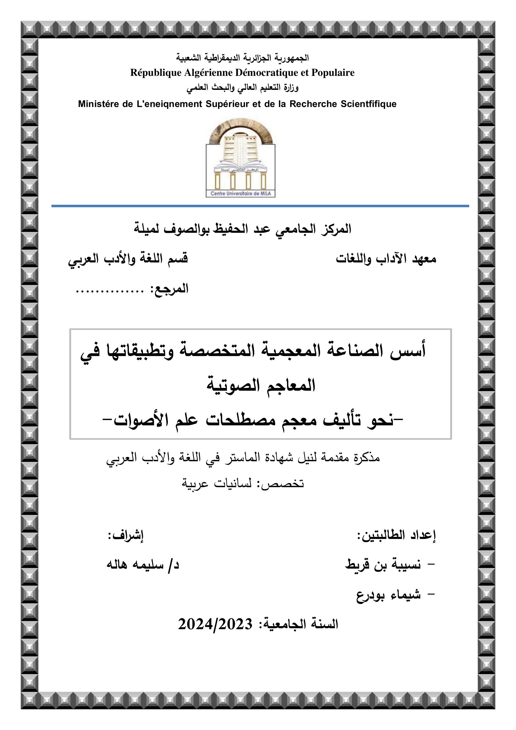 بودرع شيماء et al. (2024). أسس الصناعة المعجمية المتخصصة وتطبيقاتها في المعاجم الصوتية - نحو تأليف معجم مصطلحات علم الأصوات- (ماستر- ل م د) . المركز الجامعي عبد الحفيظ بوالصوف ميلة.