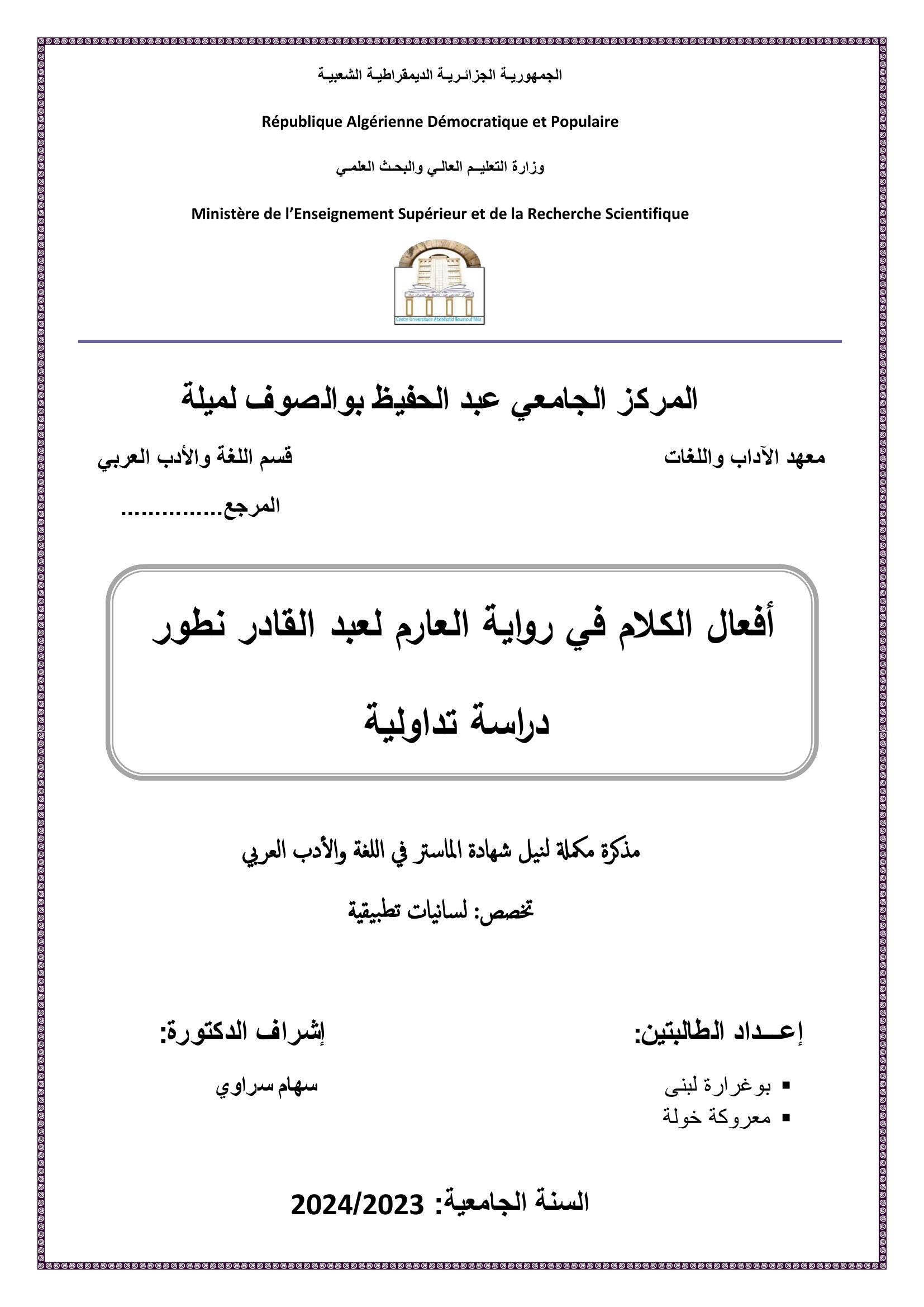 معروكة خولة et al. (2024). أفعال الكلام في رواية " العارم" لعبد القادر نطور دراسة تداولية (ماستر- ل م د) . المركز الجامعي عبد الحفيظ بوالصوف ميلة.