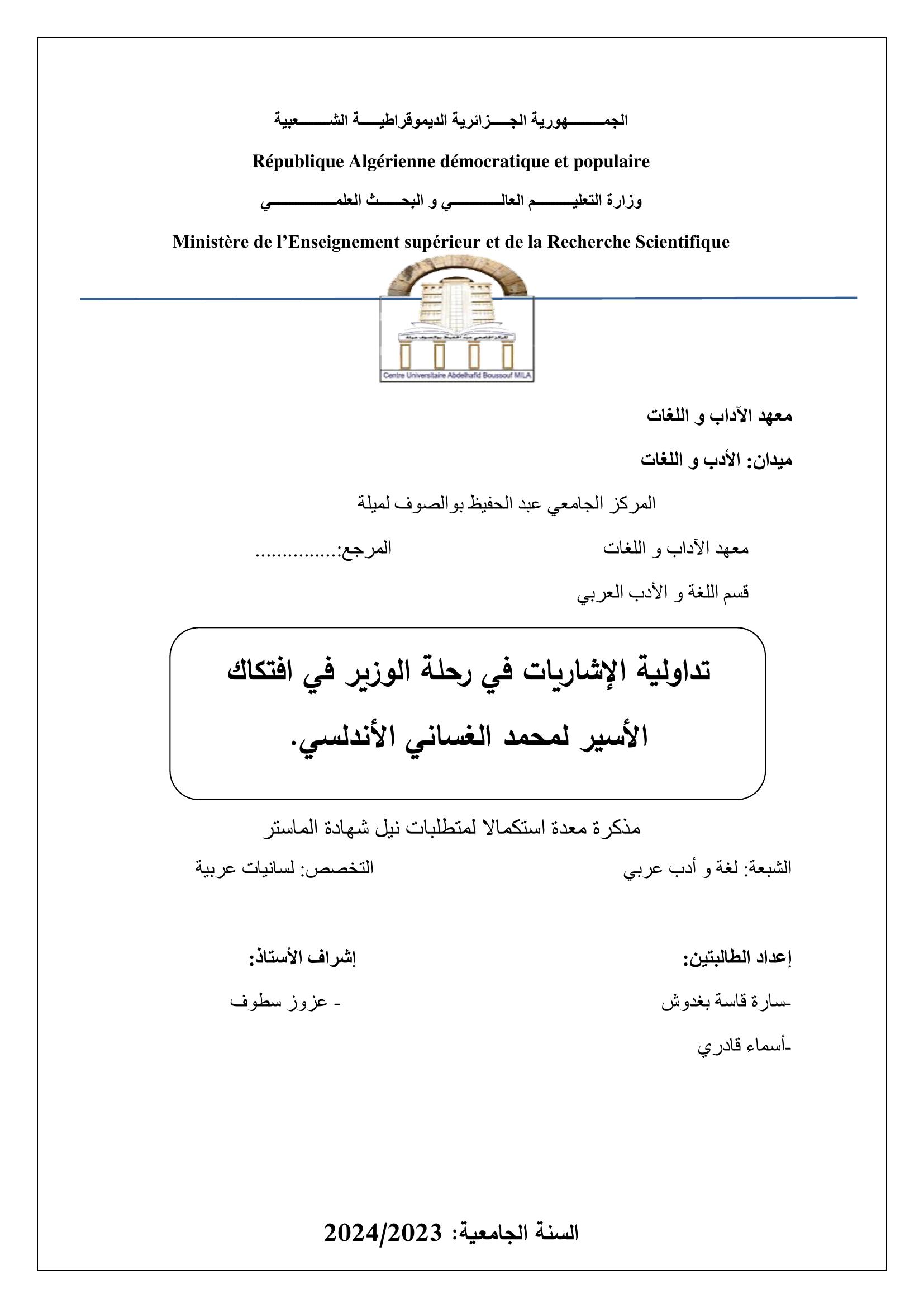 قاسة بغدوش سارة et al. (2024). تداولية الاشاريات في رحلة الوزير في افتكاك الأسير . لمحمد الغساني الأندلسي (ماستر- ل م د) . المركز الجامعي عبد الحفيظ بوالصوف ميلة.