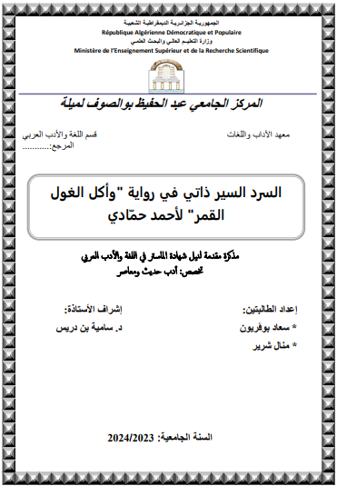بوقريون سعاد et al. (2024). السرد السيرذاتي في رواية " وأكل الغول القمر" لأحمد حمادي (ماستر- ل م د) . المركز الجامعي عبد الحفيظ بوالصوف ميلة.