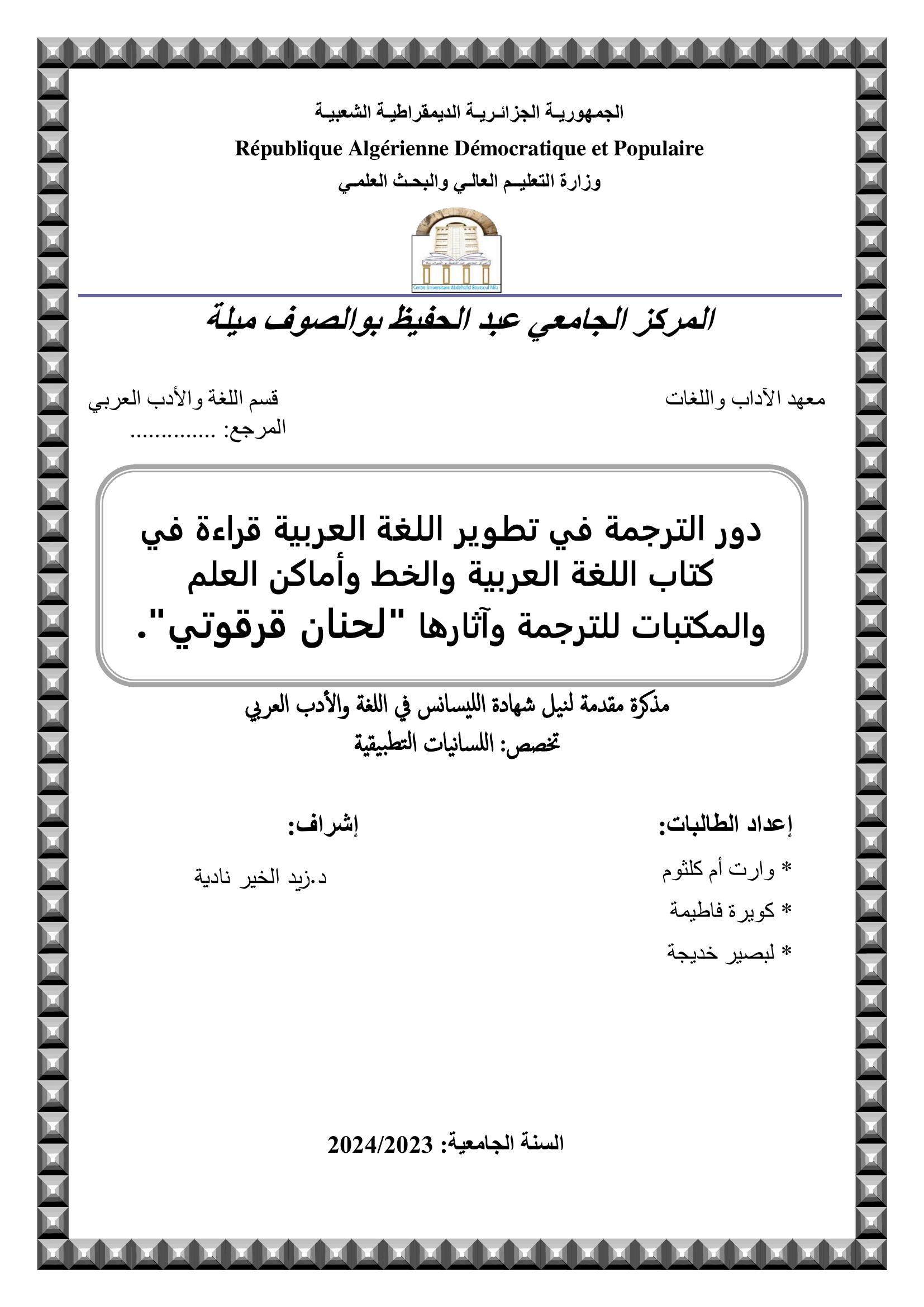 وارث أم كلثوم et al. (2024). دور الترجمة في تطوير اللغة العربية-قراءة في كتاب اللغة العربية والخط و أماكن العلم و المكتبات للترجمة و آثارها لحنان قرقوتي (ليسانس- ل م د) . المركز الجامعي عبد الحفيظ بوالصوف ميلة.