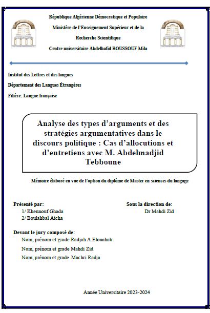 Khennouf Ghada et al. (2024). Analyse des types d’arguments et des stratégies argumentatives dans le discours politique : Cas d’allocutions et d’entretiens avec M. Abdelmadjid Tebboune (Master-LMD) . Centre universitaire Abdelhafid Boussouf Mila.
