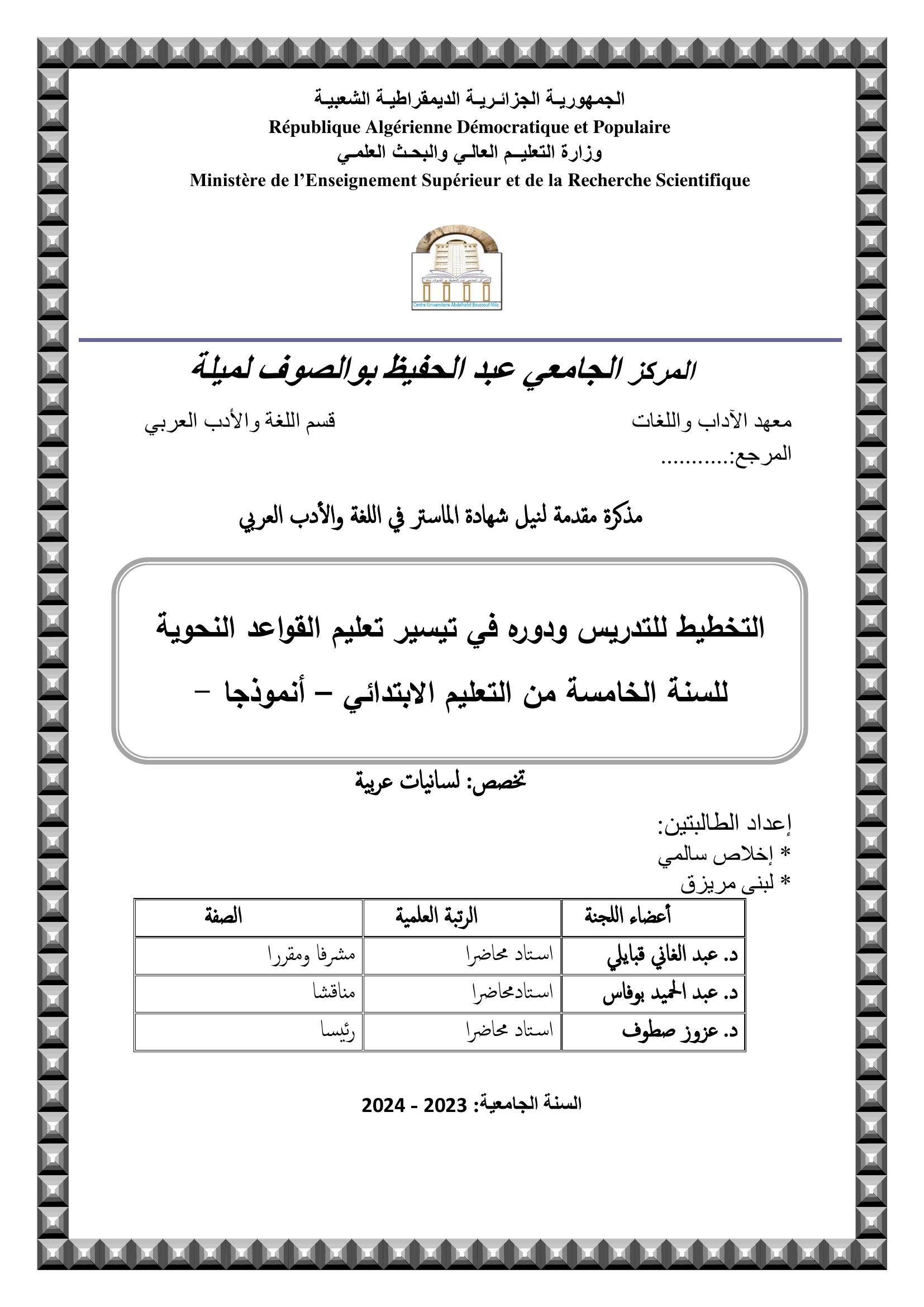 سالمي إخلاص et al. (2024). التخطيط للتدريس ودوره في تيسير تعليم القواعد النحوية للسنة الخامسة من التعليم الابتدائي – أنموذجا - (ماستر- ل م د) . المركز الجامعي عبد الحفيظ بوالصوف ميلة.