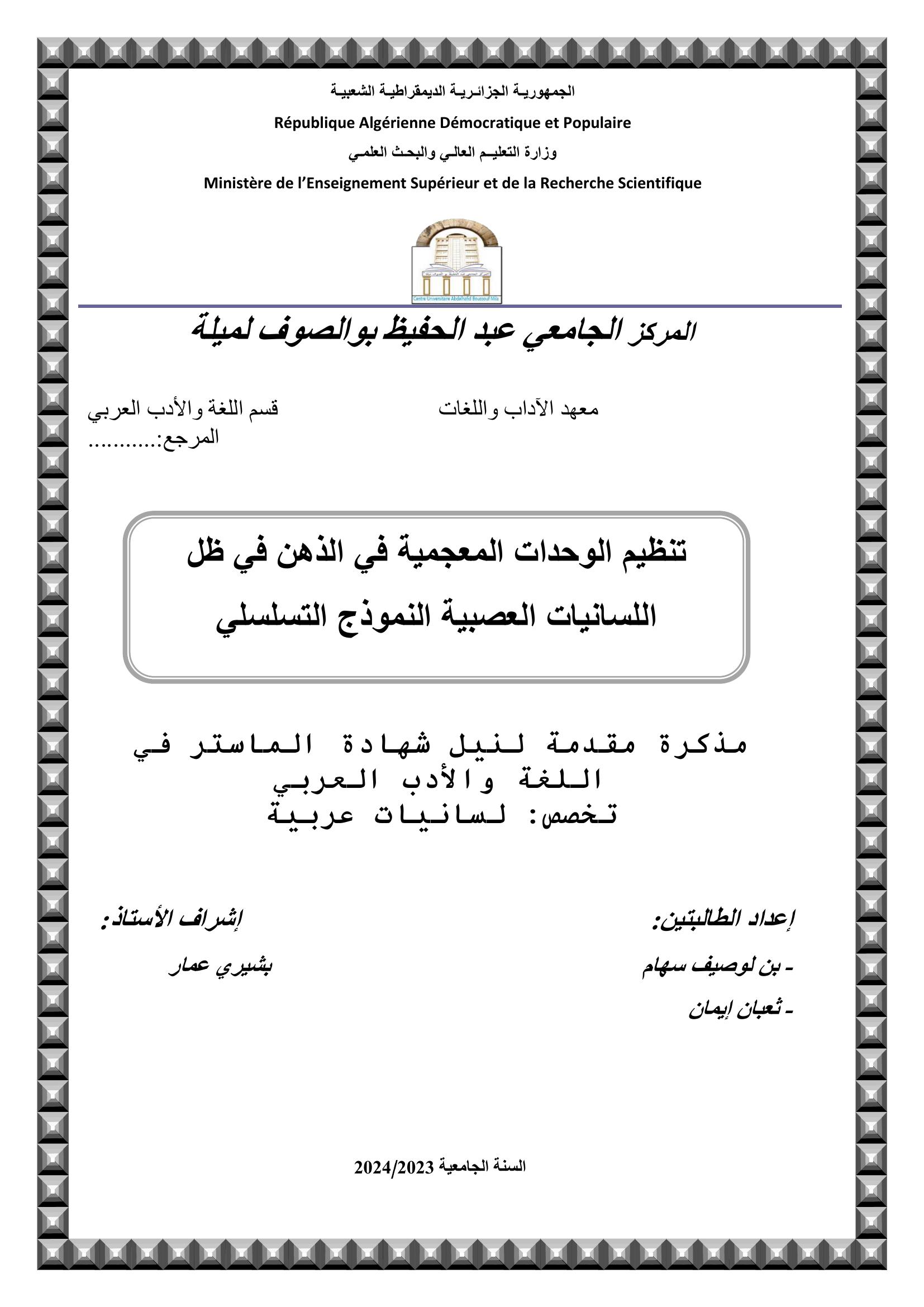 بن لوصيف سهام et al. (2024). تنظيم الوحدات المعجمية في الذهن في ظل اللسانيات العصبية النموذج التسلسلي (ماستر- ل م د) . المركز الجامعي عبد الحفيظ بوالصوف ميلة.