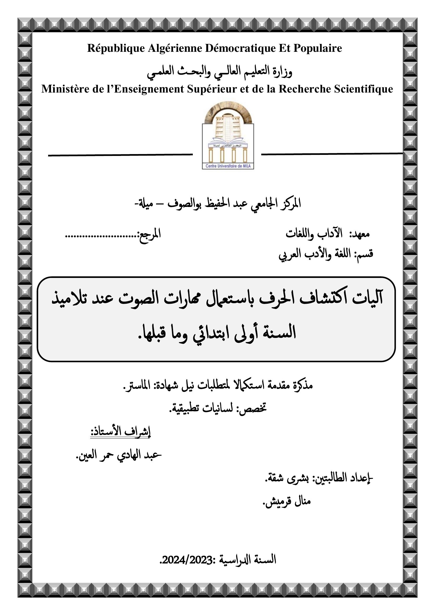 شقة بشرى et al. (2024). آليات اكتشاف الحرف باستخدام مهارات الصوت عند تلاميذ السنة الأولى ابتدائي وما قبلها (ماستر- ل م د) . المركز الجامعي عبد الحفيظ بوالصوف ميلة.