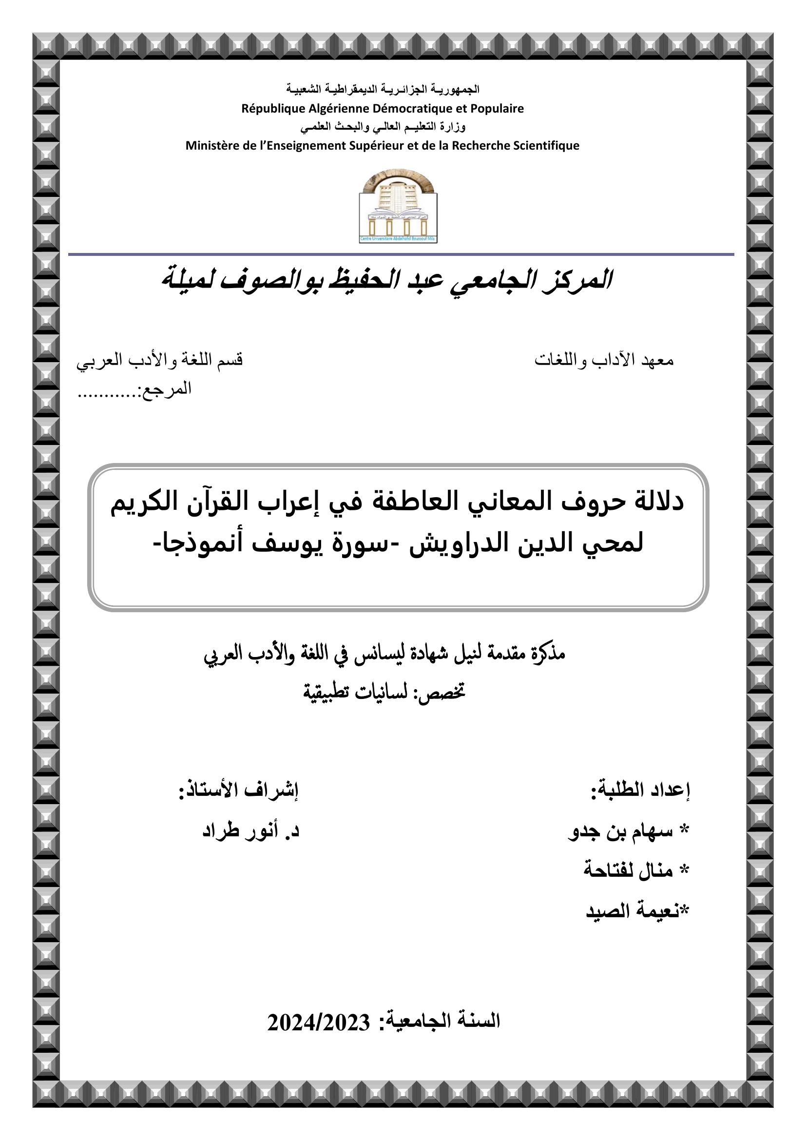 بن جدو سهام et al. (2024). دلالة حروف المعاني العاطفة في إعراب القران الكريم لمحي الدين الدراويش- سورة يوسف أنموذجا (ليسانس- ل م د) . المركز الجامعي عبد الحفيظ بوالصوف ميلة.