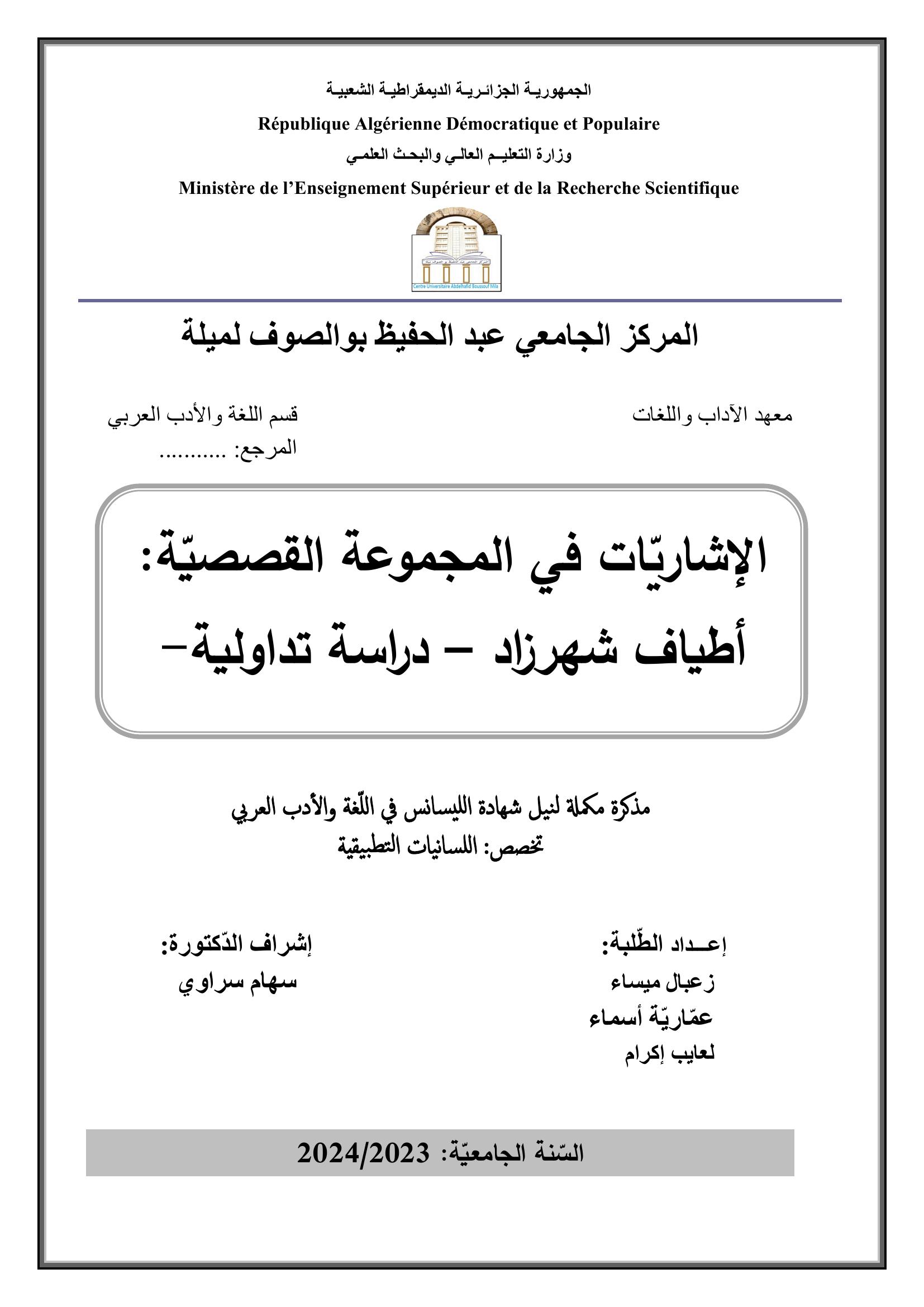 عمارية أسماء et al. (2024). الإشاريات في المجموعة القصصية :أطياف شهرزاد -دراسة تداولية- (ليسانس- ل م د) . المركز الجامعي عبد الحفيظ بوالصوف ميلة.