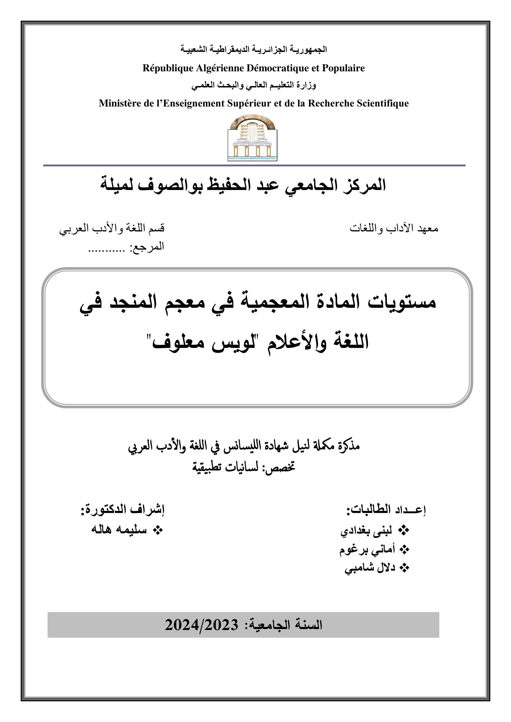 بغدادي لبنى et al. (2024). مستويات المادة المعجمية في معجم المنجد في اللغة والأعلام "لويس معلوف" (ليسانس- ل م د) . المركز الجامعي عبد الحفيظ بوالصوف ميلة.