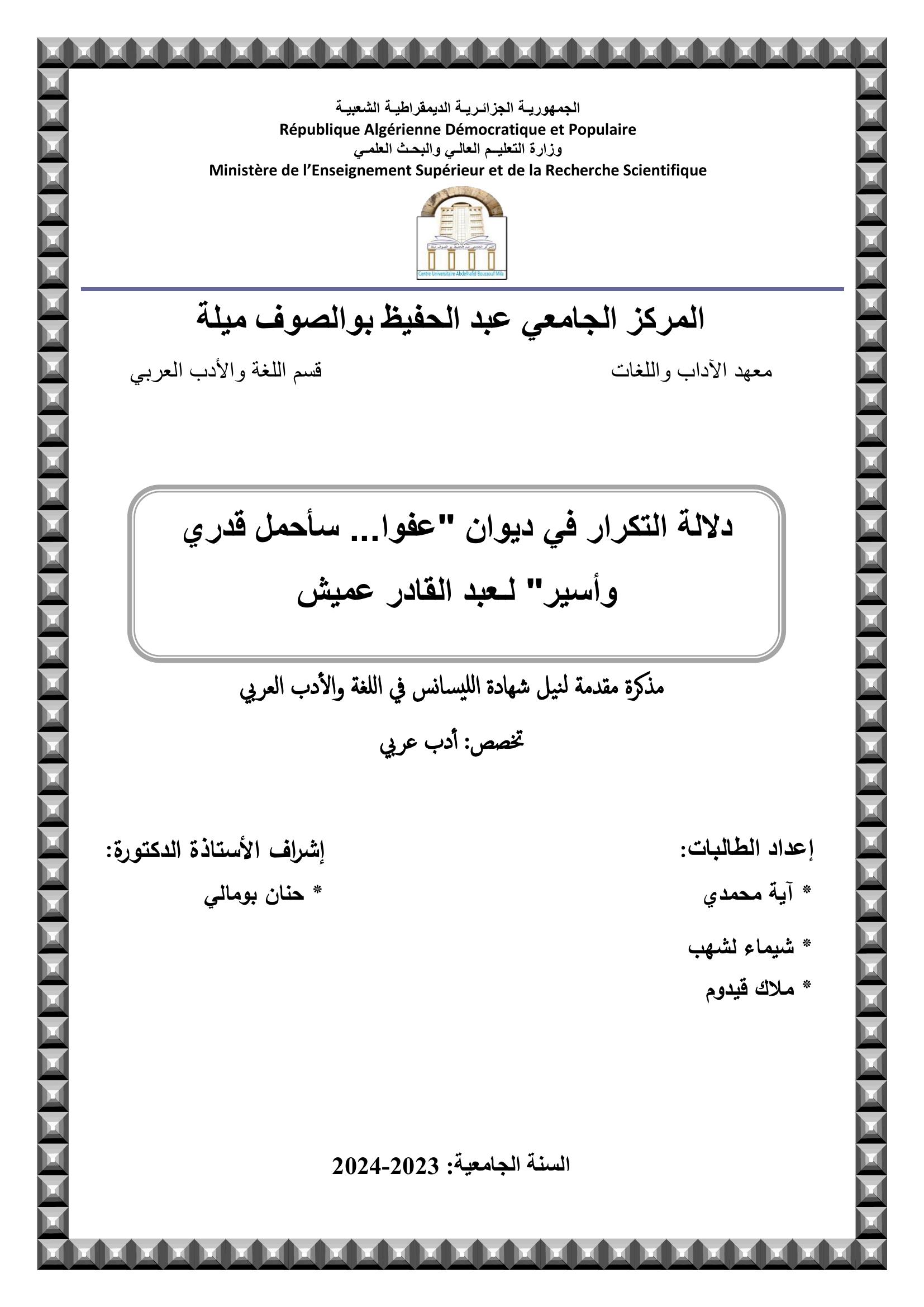 محمدي آية et al. (2024). دلالة التكرار في ديوان" عفوا ... سأحمل قدري وأسير" لعبد القادر عميش (ليسانس- ل م د) . المركز الجامعي عبد الحفيظ بوالصوف ميلة.