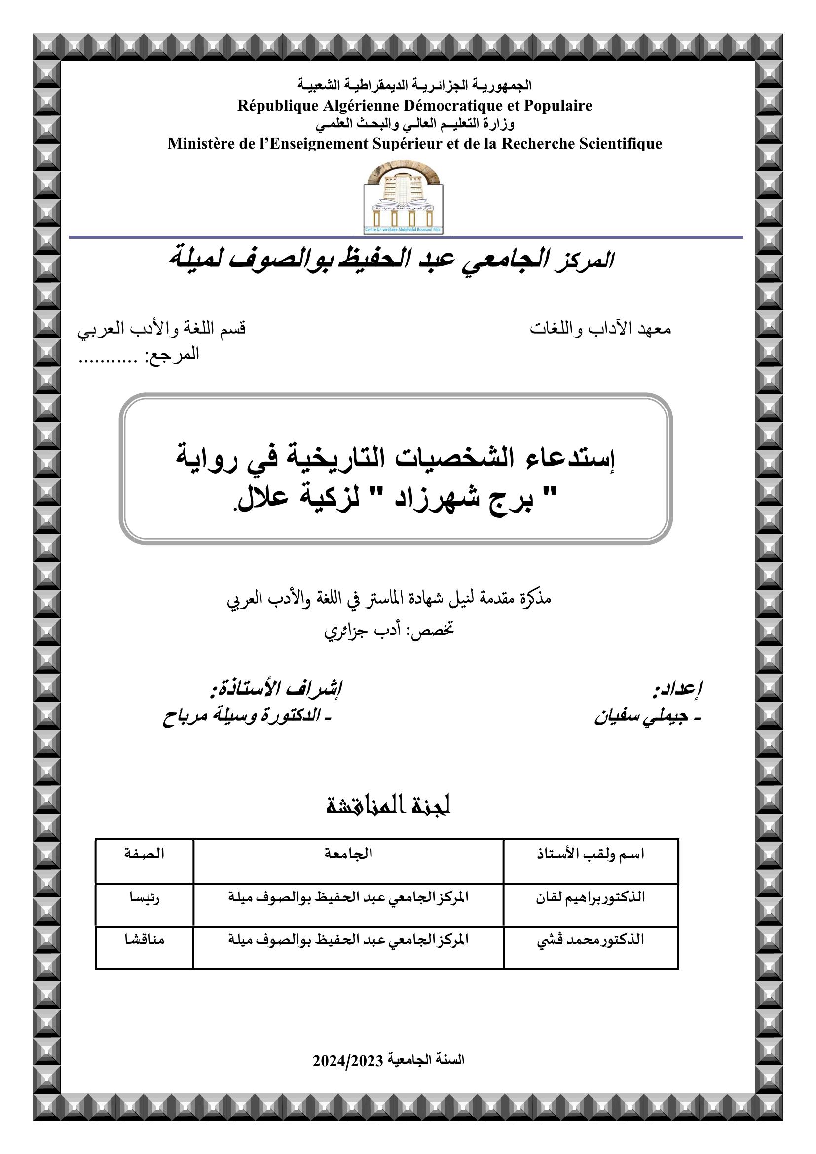 جيملي سفيان (2024). إستدعاء الشخصيات التاريخية في رواية " برج شهرزاد " لزكية علال. (ماستر- ل م د) . المركز الجامعي عبد الحفيظ بوالصوف ميلة.