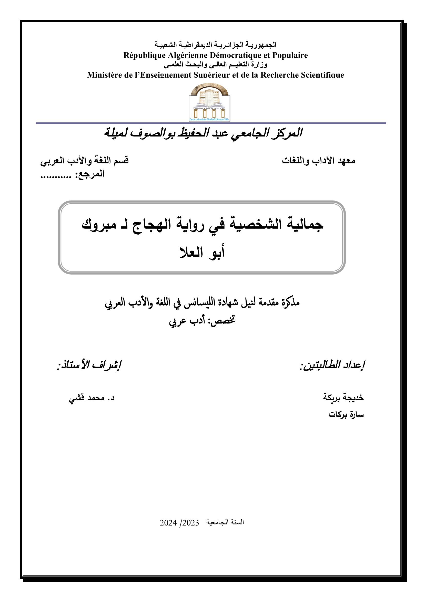بريكة خديجة et al. (2024). جمالية الشخصية في رواية الهجّاج" لمبروك أبو العلا (ليسانس- ل م د) . المركز الجامعي عبد الحفيظ بوالصوف ميلة.