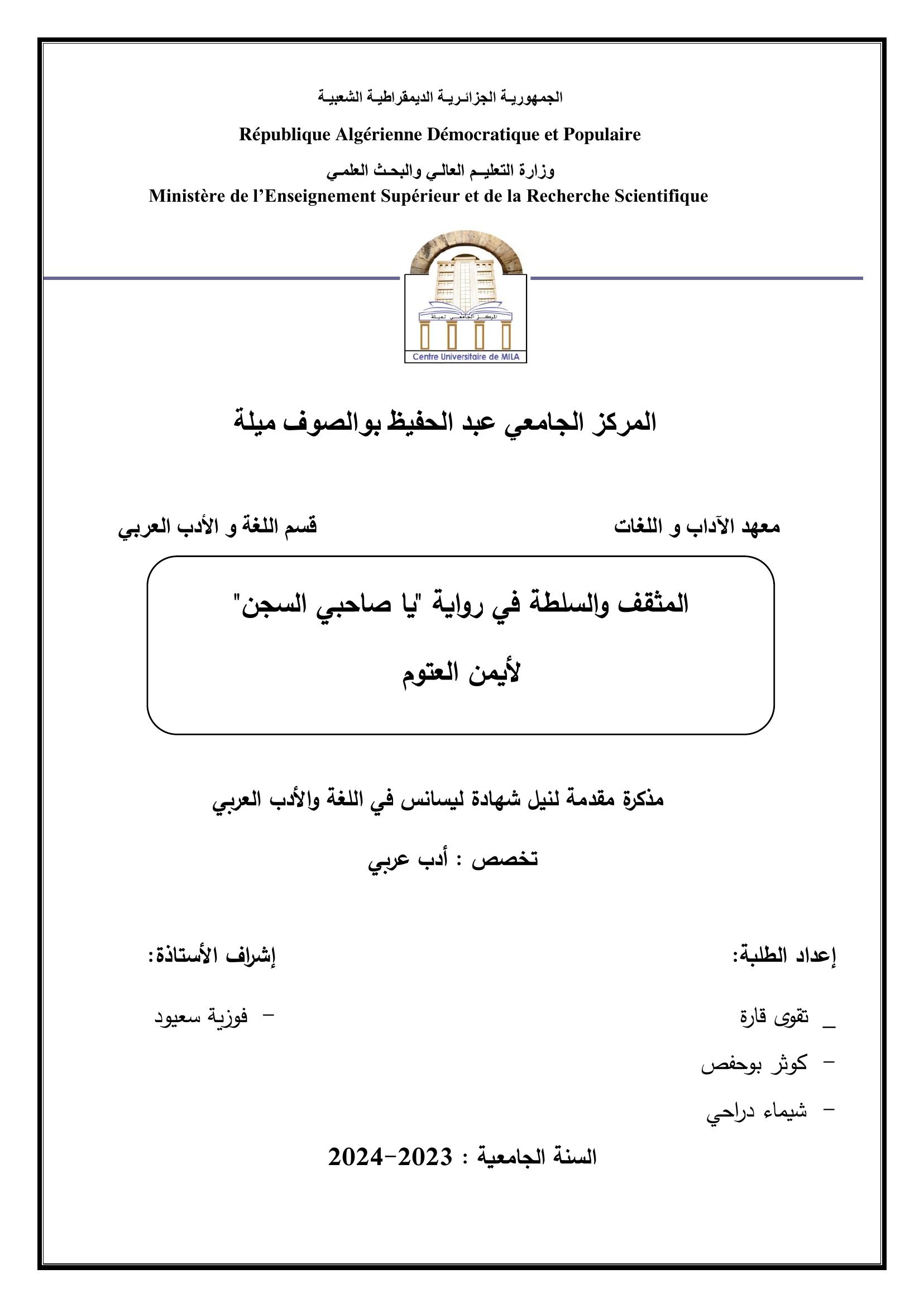 بوحفص كوثر et al. (2024). المثقف والسلطة في رواية "يا صاحبي السجن" لأيمن العتوم (ليسانس- ل م د) . المركز الجامعي عبد الحفيظ بوالصوف ميلة.