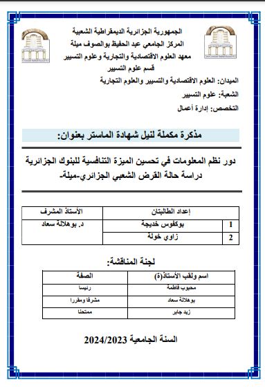 زاوي خولة et al. (2024). دور نظم المعلومات في تحسين الميزة التنافسية للبنوك الجزائرية: دراسة حالة بنك القرض الشعبي الجزائري CPA (ماستر- ل م د) .