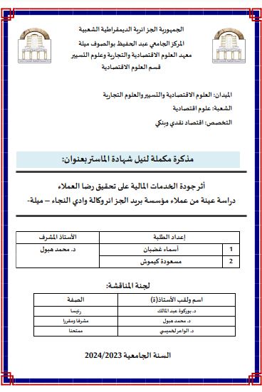 كيموش مسعودة et al. (2024). أثر جودة الخدمات المالية على تحقيق رضا العملاء: دراسة عينة من عملاء مؤسسة بريد الجزائر بولاية ميلة (ماستر- ل م د) .
