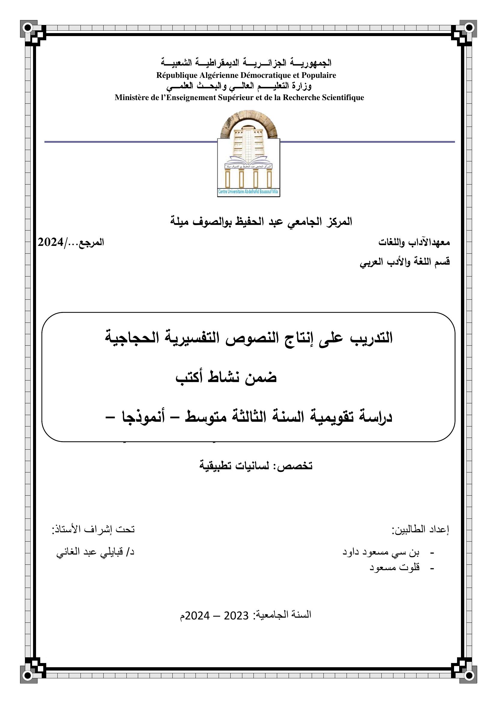 بن سي مسعود داود et al. (2024). التدريب على إنتاج النصوص التفسيرية الحجاجية ضمن نشاط أكتب د ا رسة تقويمية السنة الثالثة متوسط – أنموذجا – (ماستر- ل م د) . المركز الجامعي عبد الحفيظ بوالصوف ميلة.