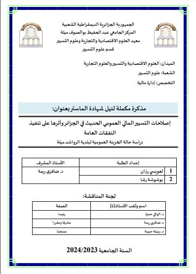 إصلاحات التسيير المالي العمومي الحديث في الجزائر وأثرها على تنفيذ النفقات العامة: دراسة حالة الخزينة العمومية لبلدية الرواشد -ميلة