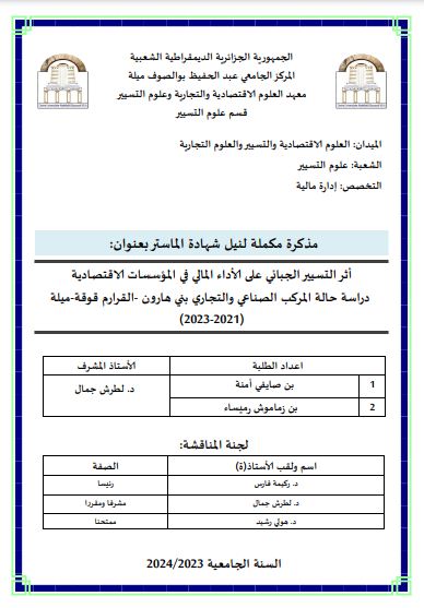 بن زماموش رميساء et al. (2024). أثر التسيير الجبائي على الأداء المالي للمؤسسة الاقتصادية: دراسة حالة مطاحن بني هارون القرارم قوقة -ميلة (ماستر- ل م د) .