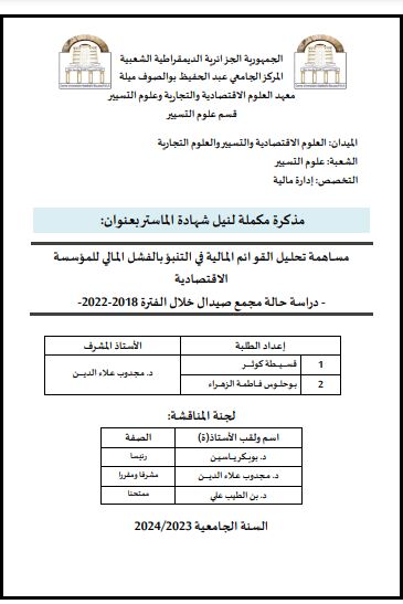 قسيطة كوثر et al. (2024). مساهمة تحليل القوائم المالية في التنبؤ بالفشل المالي في المؤسسة الاقتصادية - دراسة حالة مجمع صيدال خلال الفترة 2018 – 2022 (ماستر- ل م د) .