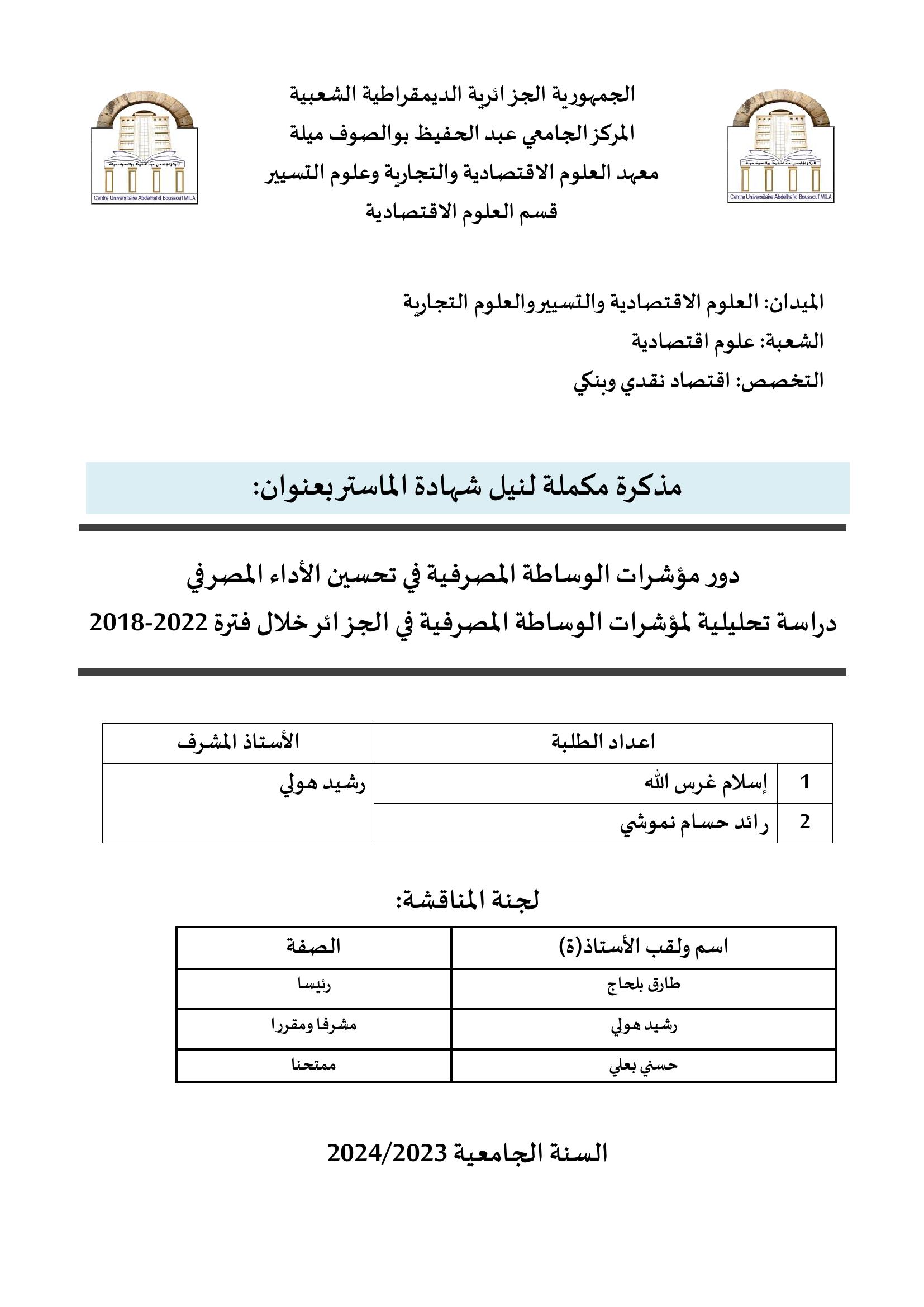 دور مؤشرات الوساطة المصرفية في تحسين الأداء المصرفي: دراسة تحليلية لمؤشرات الوساطة المصرفية في الجزائر خلال الفترة 2018-2022