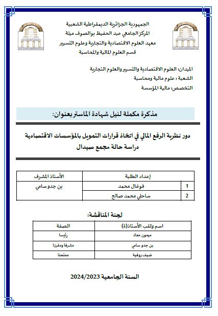 فوغال محمد et al. (2024). دور نظرية الرفع المالي في اتخاذ قرارات التمويل بالمؤسسات الاقتصادية: دراسة حالة مجمع صيدال (ماستر- ل م د) . المركز الجامعي عبد الحفيظ بوالصوف ميلة.