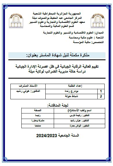 بودرع رندة et al. (2024). تقييم فعالية الرقابة الجبائية في ظل عصرنة الادارة الجبائية: دراسة حالة مديرية الضرائب لولاية ميلة (ماستر- ل م د) . المركز الجامعي عبد الحفيظ بوالصوف ميلة.