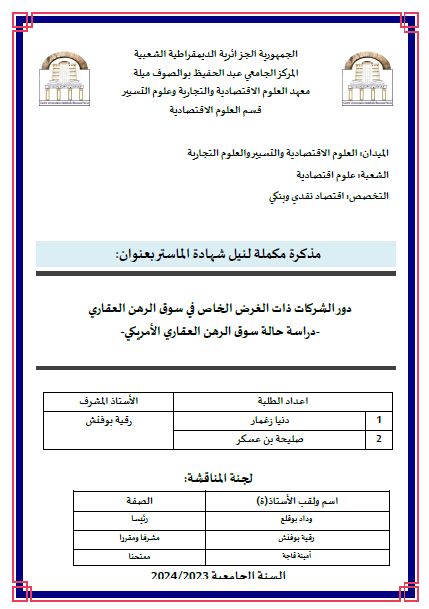 صليحة بن عسكر et al. (2024). دور الشركات ذات الغرض الخاص في سوق الرهن العقاري: دراسة حالة سوق الرهن العقاري الأمريكي (ماستر- ل م د) . المركز الجامعي عبد الحفيظ بوالصوف ميلة.