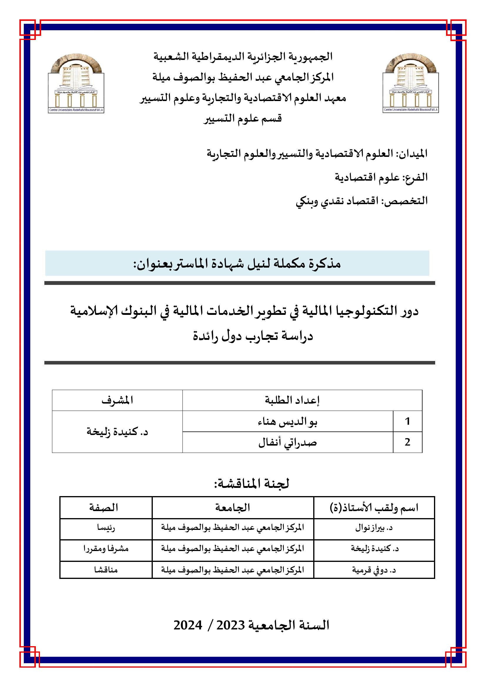 بوالديس هناء et al. (2024). دور التكنولوجيا المالية في تطوير الخدمات المالية الإسلامية: دراسة تجارب رائدة (ماستر- ل م د) . المركز الجامعي عبد الحفيظ بوالصوف ميلة.