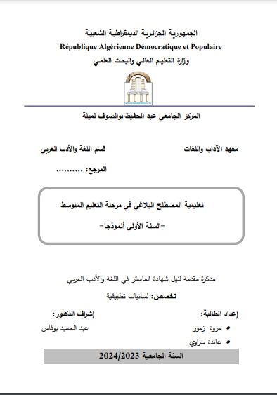 سراوي عائدة et al. (2024). تعليمية المصطلح البلاغي في مرحلة التعليم المتوسط - السنةالأولى أنموذجا- (ماستر- ل م د) . المركز الجامعي عبد الحفيظ بوالصوف ميلة.