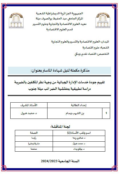 بن الشيهب وسام & هبول محمد (مشرفا) (2024). تقييم جودة خدمات الإدارة الجبائية من وجهة نظر المكلفين بالضريبة: دراسة تطبيقية بمفتشية الضرائب -ميلة جنوب (ماستر- ل م د) .