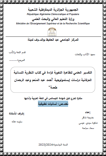 شاقر،خديجة et al. (2025). التفسير العلمي للظاهرة اللغوية قراءة في كتاب النظرية اللسانية العرفانية د راسات إبستمولوجية "أحمد عبد المنعم وعبد الرحمان طعمة'" (ليسانس- ل م د) . المركز الجامعي عبد الحفيظ بوالصوف ميلة.