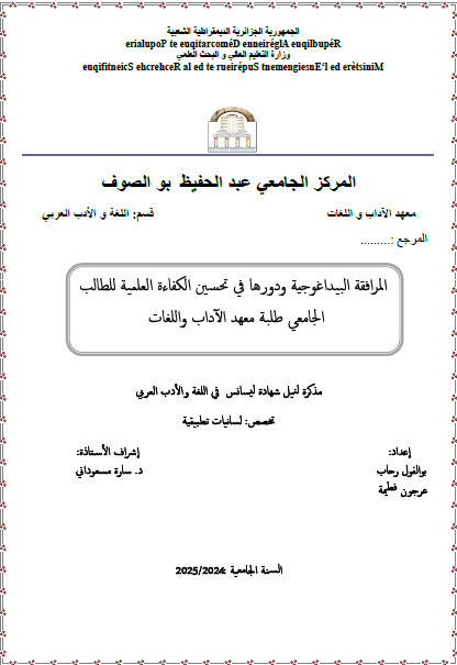 بوالفول ،رحاب et al. (2025). المرافقة البيداغوجية ودورها في تحسين الكفاءة العلمية للطالب الجامعي طلبة معهد الاداب واللغات (ليسانس- ل م د) . المركز الجامعي عبد الحفيظ بو الصوف ميلة.