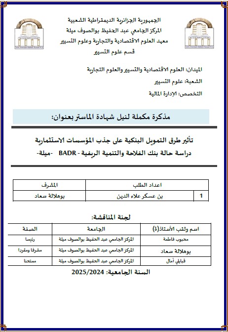 تأثير طرق التمويل البنكية على جذب المؤسسات الاستثمارية :دراسة حالة بنك الفلاحة والتنمية الريفية |BADR ميلة
