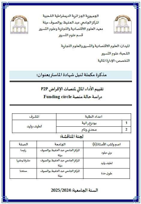 بودرع، رانية et al. (2025). تقييم الأداء المالي لمنصات الاقراض p2p دراسة حالة منصة funding circle (و.م.أ). " (ماستر- ل م د) . المركز الجامعي عبد الحفيظ بوالصوف ميلة.