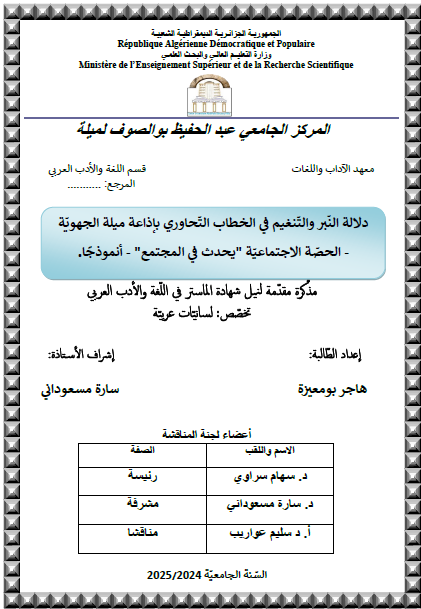 بومعيزة،هاجر & مسعوداني سارة(مشرفا) (2025). دلالة النبر والتنغيم في الخطاب التحاوري بإذاعة ميلة الجهوية الحصة الاجتماعية " يحدث في المجتمع " أنموذجا (ماستر- ل م د) . المركز الجامعي عبد الحفيظ بوالصوف ميلة.
