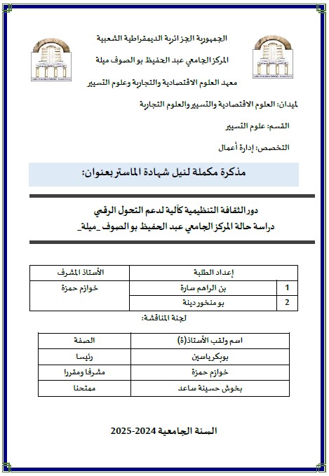 بومنخور، دينة et al. (2025). دور الثقافة التنظيمية كآلية لدعم التحول الرقمي في الجامعة الجزائرية دراسة حالة المركزالجامعي ميلة (ماستر- ل م د) . المركز الجامعي عبد الحفيظ بوالصوف ميلة.