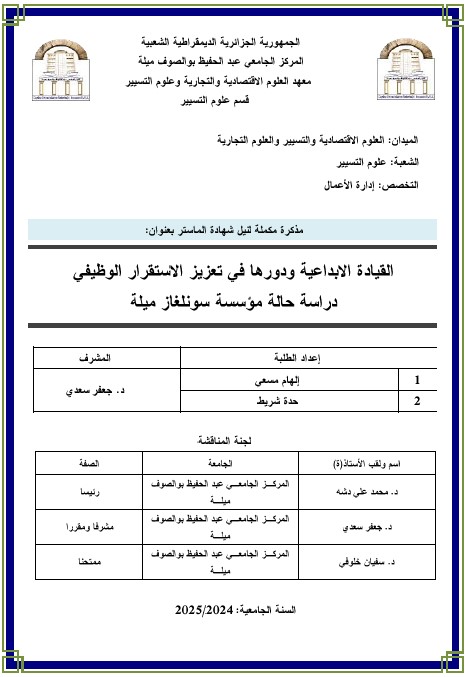 مسعي، إلهام et al. (2025). القيادة الابداعية ودورها في تعزيز الإستقرار الوظيفي دراسة حالة مؤسسة سونلغاز ميلة (ماستر- ل م د) . المركز الجامعي عبد الحفيظ بوالصوف ميلة.