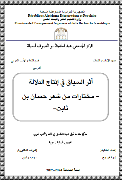 قردوح،نورة & سراوي سهام (مشرفا) (2025). أثر السياق في إنتاج الدلالة مختارات من شعر حسان بن ثابت (ماستر- ل م د) . المركز الجامعي عبد الحفيظ بوالصوف ميلة.