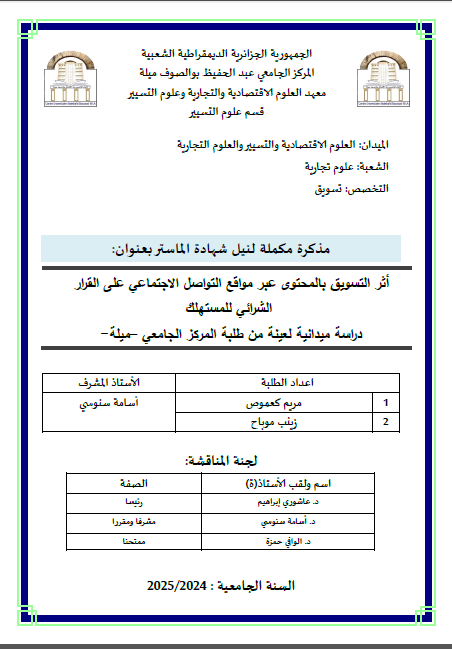 أثر التسويق بالمحتوى عبر مواقع التواصل الاجتماعي على القرار الشرائي للمستهلك دراسة ميدانية لعينة من طلبة المركز الجامعي ميلة