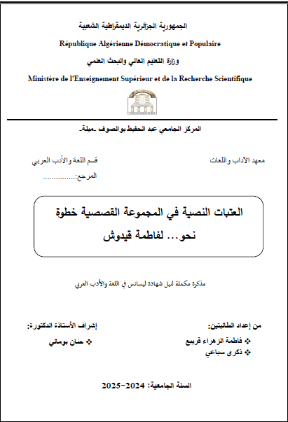 قريبع ،فاطمة الزهراء et al. (2025). العتبات النصية في المجموعة القصصية خطوة نحو... لفاطمة قيدوش (ماستر- ل م د) . المركز الجامعي عبد الحفيظ بوالصوف ميلة.