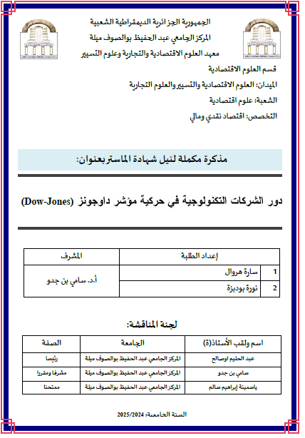 بودبزة، نورة et al. (2025). دور الشركات التكنولوجية في حركية مؤشر داوجونز (Dow-Jones) (ماستر- ل م د) . المركز الجامعي عبد الحفيظ بوالصوف ميلة.