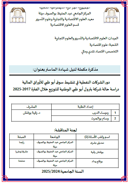 بوالحرت ،وسام et al. (2025). دور الشركات النفطية في تنشيط سوق أبوظبي للأوراق المالية دراسة حالة شركة بترول أبوظبي الوطنية للتوزيع خلال الفترة 2017- 2025" (ماستر- ل م د) . المركز الجامعي عبد الحفيظ بوالصوف ميلة.