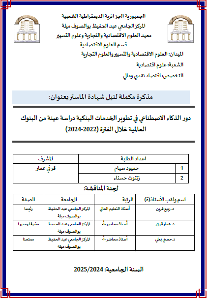 حميود ،سهام et al. (2025). دور الذكاء الاصطناعي في تطوير الخدمات البنكية، دراسة عينة من البنوك العالميةخلال الفترة من 2022-2024 (ماستر- ل م د) . المركز الجامعي عبد الحفيظ بوالصوف ميلة.