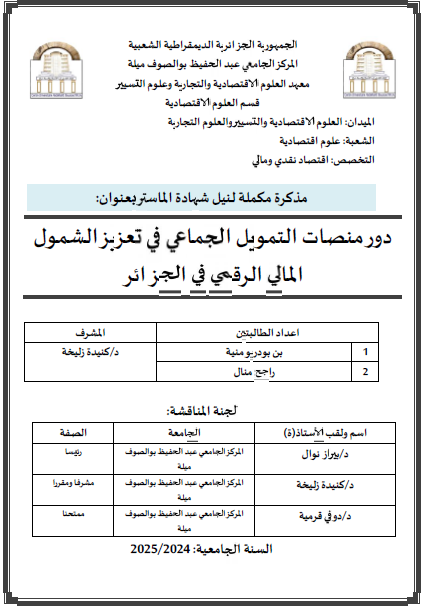 بن بودريو ،منية et al. (2025). دورمنصات التمويل الجماعي في تعزيز الشمول المالي الرقمي في الجزائر (ماستر- ل م د) . المركز الجامعي عبد الحفيظ بوالصوف ميلة.