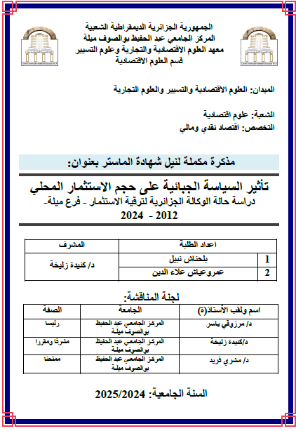 تأثير السياسة الجبائية على حجم الاستثمار المحلي -دراسة حالة الوكالة الجزائرية لترقية الاستثمار وكالة ميلة-