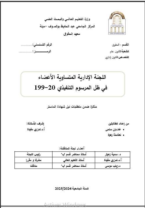 غضبان،سلمى et al. (2025). اللجنة الإدارية المتساوية الأعضاء في ظل المرسوم التنفيذي رقم 20-199 (ماستر- ل م د) . المركز الجامعي عبد الحفيظ بوالصوف ميلة.