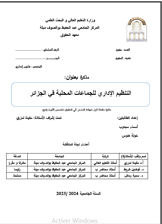 مجدوب ،اسماء et al. (2025). التنظيم الإداري للجماعات المحلية في الجزائر (ماستر- ل م د) . المركز الجامعي عبد الحفيظ بوالصوف ميلة.