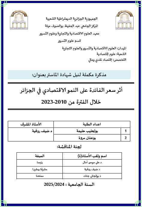 بولحليب،حليمة et al. (2025). أثر سعر الفائدة على النمو الاقتصادي في الجزائر خلال الفترة من 2010-2023 (ماستر- ل م د) . المركز الجامعي عبد الحفيظ بوالصوف ميلة.